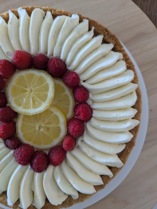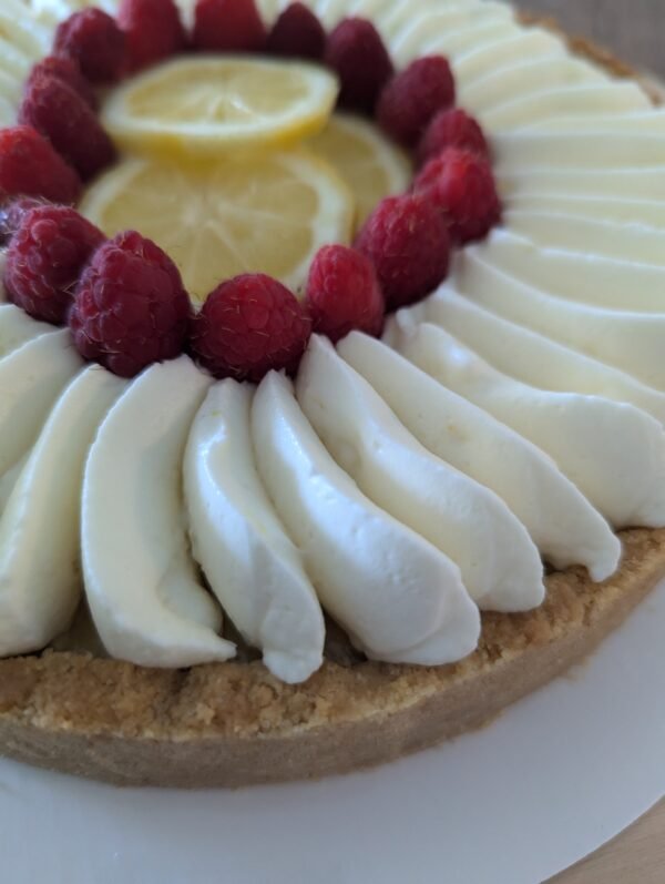 A buttery tart crust filled with smooth lemon and white Chocolate cream, topped with fresh raspberries and slices of lemon. Light, zesty, and beautifully balanced.