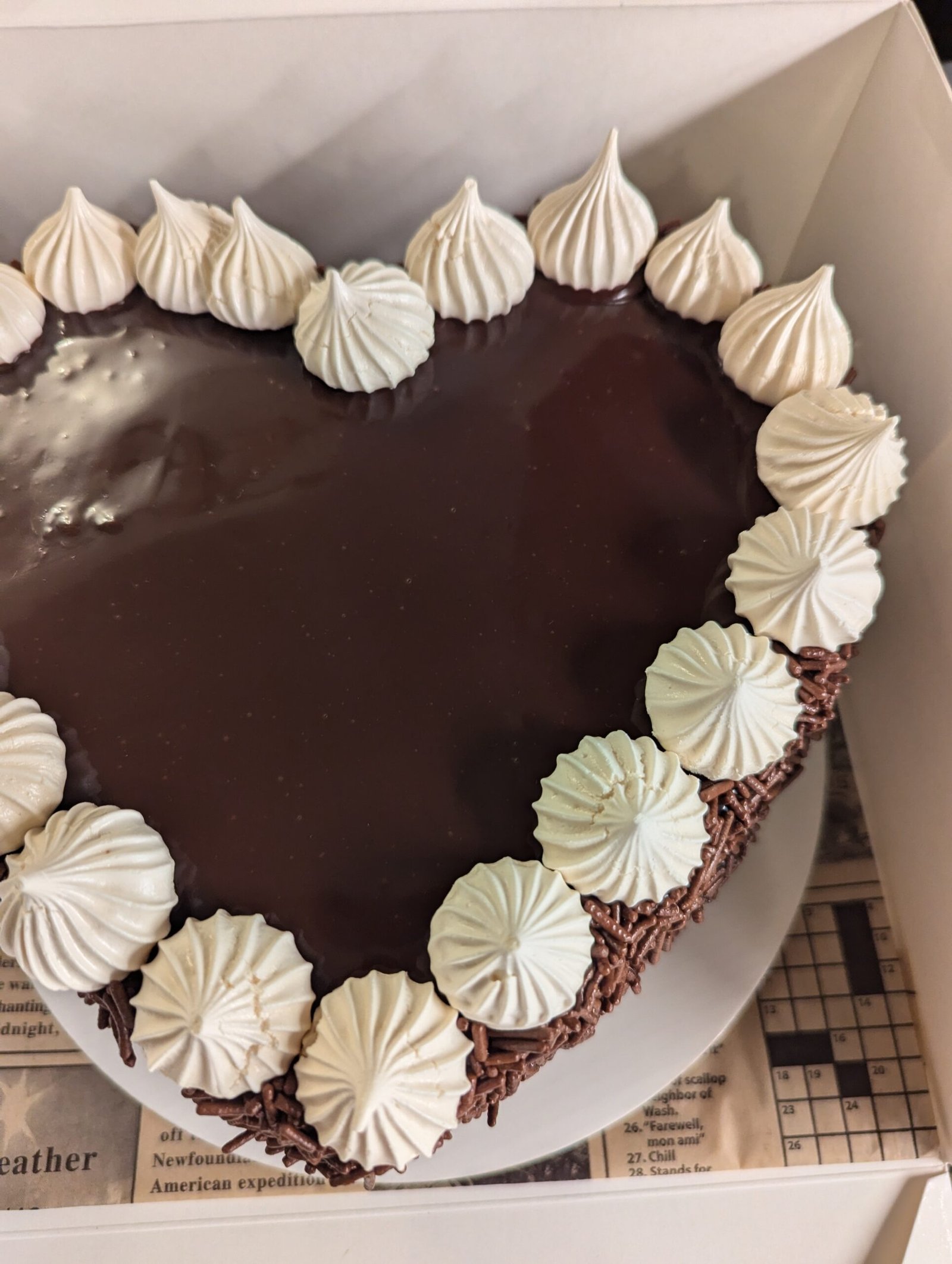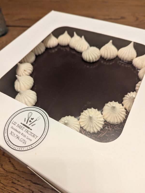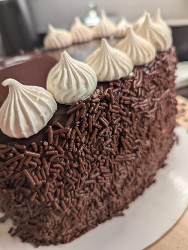 A rich, moist chocolate cake filled with creamy Nutella, coated in silky ganache and covered in a layer of chocolate sprinkles. Finished with hand-piped vanilla meringue kisses for a perfect crunch.